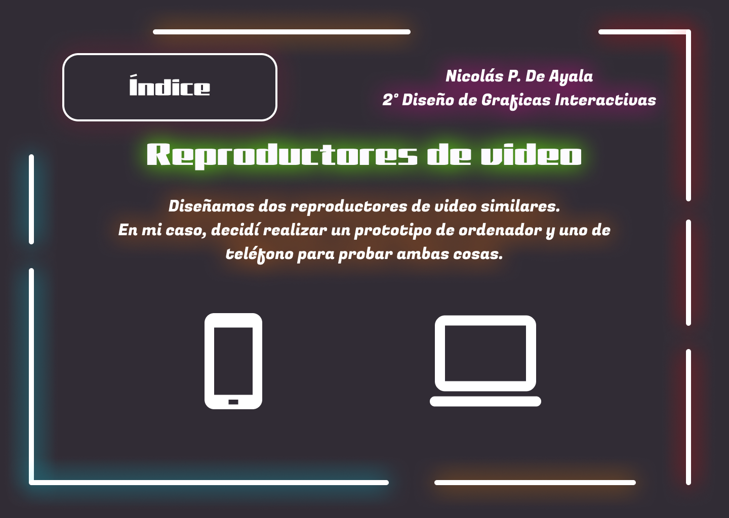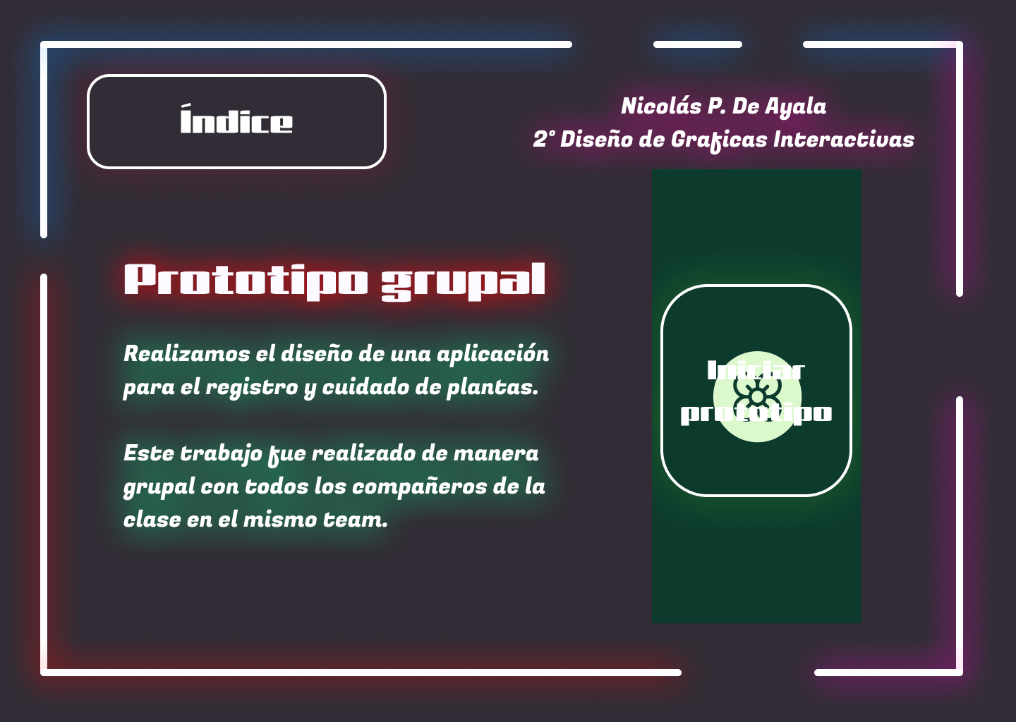 Un menú para organizar y mostrar todos los trabajos realizados durante el primer trimestre de mi segundo año de Diseño Gráfico Interactivo. Los colores neones son el interés visual principal del entorno.